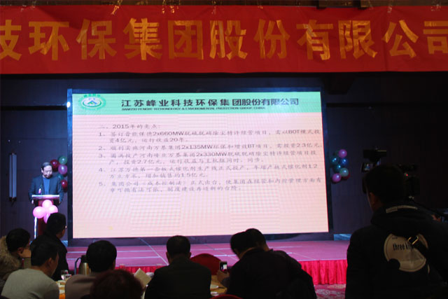 当日下午15:18分江苏峰业集团公司2015年度表彰大会正式开始,由董秘兼集团副总裁王飞主持会议,会议上由总裁助理许峰,子公司副总裁王斌、朱军武,总工王文选,设计部经理杨宝成等就2015年度工作发表感言,由董事长总裁许德富作总结,会上许总发表了热情洋溢的演讲,他表示在2015年严峻的市场形势下,公司顺利完成了预期目标,对支持峰业发展的各位朋友表示诚挚的谢意!向兢兢业业辛勤工作在公司各条战线上的每一位峰业人表示衷心的感谢!许总回顾总结了2015年的峰业发展历程和取得累累硕果,并展望了充满希望的2016年。前途是光明的,道路是曲折的。希望全体员工在新的一年里,齐心努力,再创辉煌,共同迎接更美好的明天!