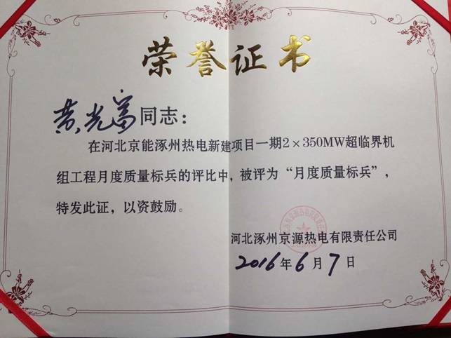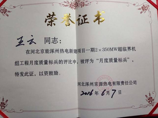 涿州项目部王鹏、王云、黄光富三名同志获得业主“月度质量标兵”荣誉表彰!